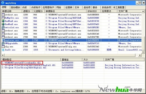 3) 为检查病毒文件是否还会再生,用XueTr工具对移动磁盘进行刷新操作,这时会发现,两个病毒文件又出现了,据此分析系统中还有残余的病毒文件仍在加载,并不停地向U盘中创建后缀为.exe的文件夹。为了彻底清除病毒文件,再回到进程中逐一检查系统当前所有进程下加载的文件后,发现explorer.exe下挂有可疑模块iconhandle.dll,且无数字签名。(如图4)