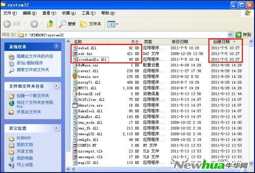 4) 找到该文件所在目录C:\WINDOWS\system32,并利用“创建日期”排列该目录下所有文件查看详细,这时发现了意外收获:该目录下的webad.dll和web.dat两个文件与iconhandle.dll的创建时间相同,再仔细检查一下你会发现web.dat文件大小为421KB,与U盘下的两个病毒文件夹大小一致!且正常系统中C:\WINDOWS\system32路径下原本就不存在这三个文件,由此可以推断三个文件都是由病毒创建,可以全部删除。(如图5)