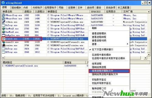 1) 查找并结束系统中明显的异常进程winweb.exe,右键将其选中,并选择“结束进行并删除文件”操作。(如图2)