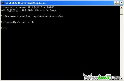 计算机重启后需要进行最后的检查工作,通过XueTr查看explorer.exe进程下已不再加载iconhandle.dll,并且C:\WINDOWS\system32目录下的三个可疑文件都不复存在,明显的病毒迹象已不再复现,再次尝试删除U盘下的“我的照片.exe”和“办公文档.exe”会发现病毒文件夹不会再次生成了。如此看来该U盘病毒算是清理干净了,但是原有的文件夹系统属性仍为隐藏且无法修改,那么还得进行手工杀毒后的善后操作,此处可通过attrib指令修改文件夹系统属性,方法如下:(如图8)
