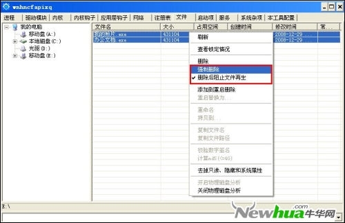2) 利用XueTr工具强制删除U盘中的两个病毒文件“我的照片.exe”和“办公文档.exe”,注意勾选“删除后阻止文件再生”。(如图3)