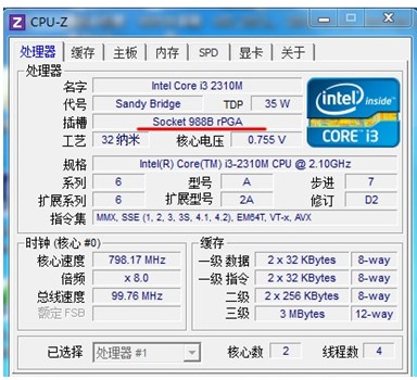 对于用户而言,一个很现实的问题就是:如何在不拆机的情况下判断自己处理器的安装方式呢?除了开盖/拆机直接查看外,大家可以借助最新版的CPU-Z软件来查看,运行后在软件主界面的“插槽”一栏中就可以看到该处理器插槽的类型,如SNB平台的Core i3 2310M处理器,CPU-Z显示的接口类型为“Socket 988B rPGA”,此时意味着处理器可更换;而对于直接焊接在主板上的Core i5 4200U此项目则显示为“Socket 1168 BGA”,则不可更换。