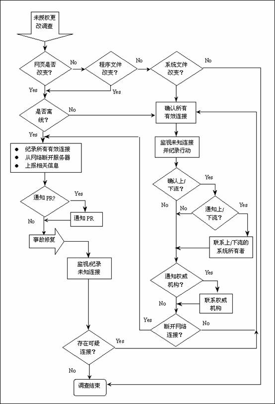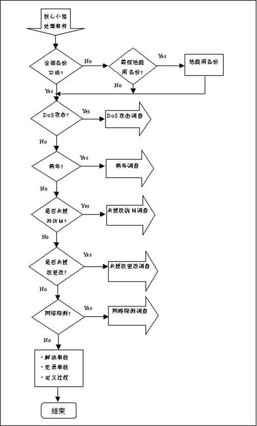 - 计算机安全事件已经被确认后,必须马上成立“紧急事件响应核心组”以制定策略并推进调查进程。接下来的过程因所发生的攻击类型来决定。